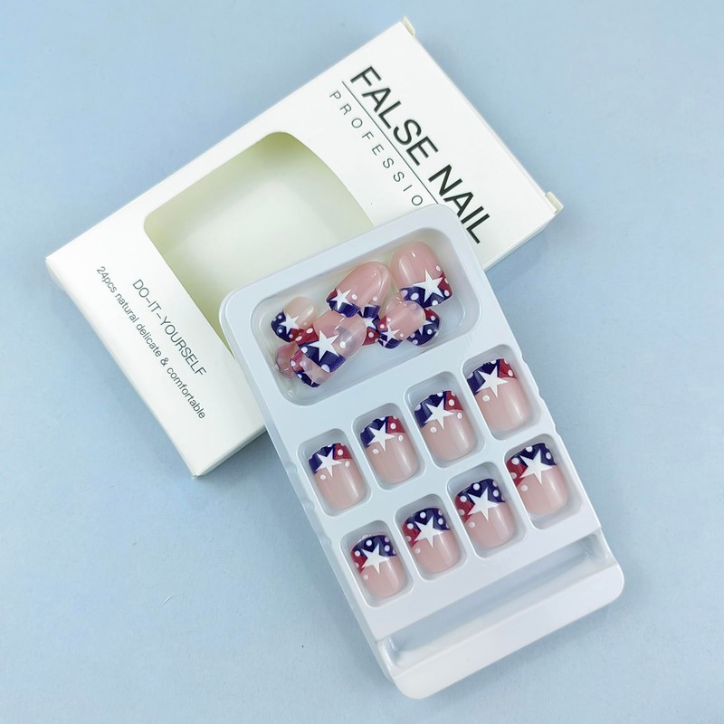- 【Package Contents】There 24pcs Independence Day french tip press on nails short and 1 nail file and 24pcs jelly glue and 1 nail glue and 1 alcohol cotton and 1 wooden stick.this false nails with designs five-pointed star.
