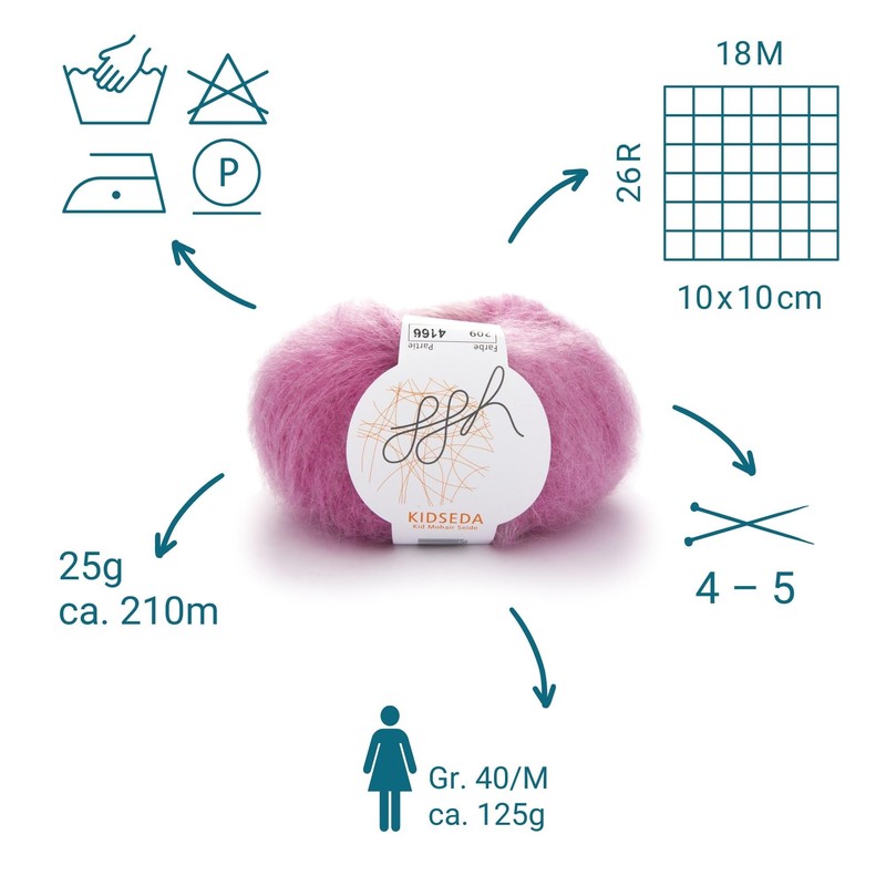 - 70% kid-mohair / 30% silk - 25 g wool as a ball, running length per 25 g wool ball approx. 210 m - needle size 4-5, consumption 125 g for a jumper in size 40, hand wash, made in Italy.