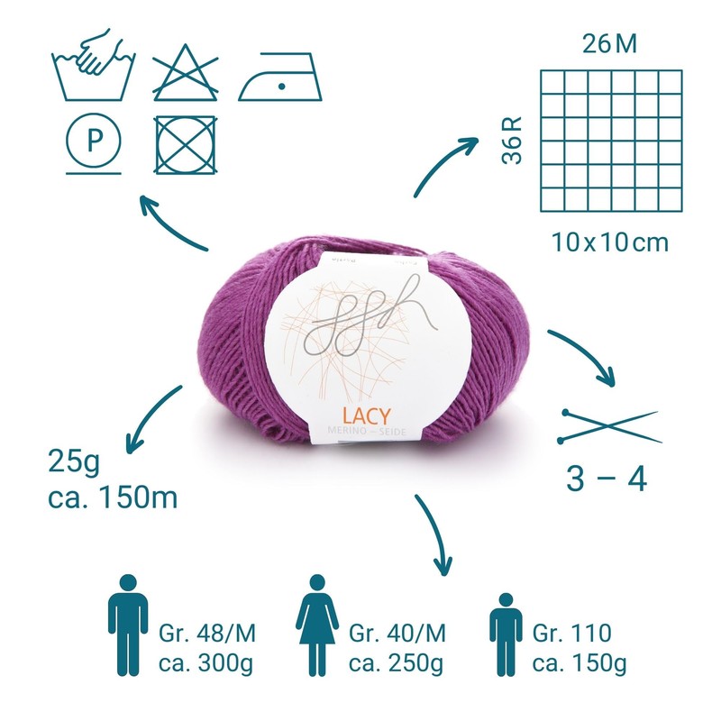 - ggh Lacy is the fine, thin lace yarn from ggh. The special thing about Lacy is its soft, smooth feel. The harmonious composition of this high-quality wool is made of fine merino wool and silk. This makes the colours particularly brilliant and gives the wool a very subtle shine.