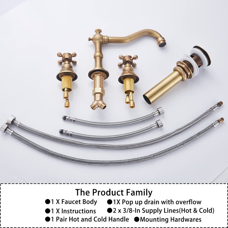 GGStudy 8 inch 2 Handles 3 Holes Widespread Bathroom Sink Faucet Antique Brass Bathroom Vanity Faucet Basin Mixer Tap Faucet Matching Metal Pop Up Drain with Overflow