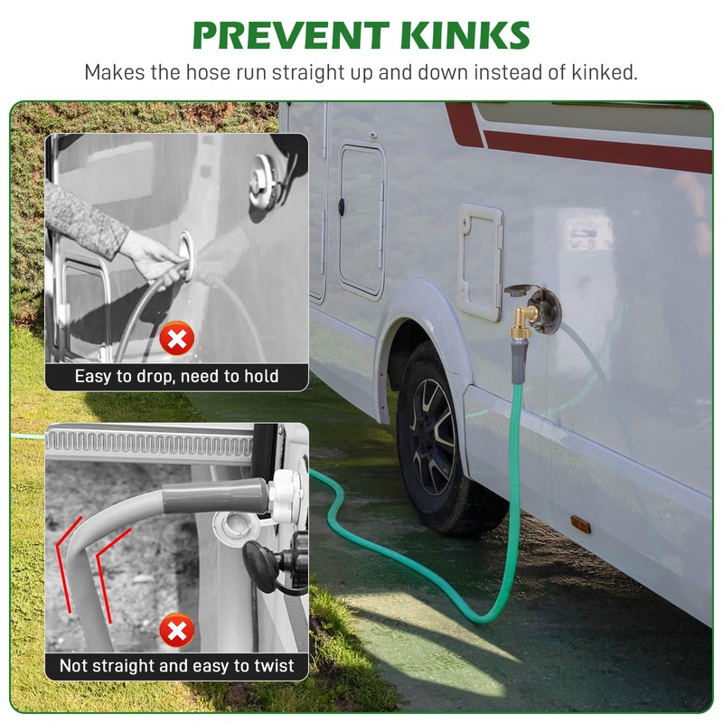 - 🌿 90 Degree Water Hose Elbow: With its innovative design, this hose elbow effectively prevents kinks in your water hose, ensuring a steady flow of water for your RV needs. No more frustrating stops to unkink the hose or worry about interrupted water supply.