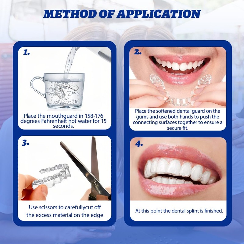 • Bequeme Bedienung, schneller Start: 4 einfache Schritte (Erweichen mit heißem Wasser - Bissformung - Trimmen der Ränder - fertige Verwendung), ohne professionelle Hilfe, können Sie leicht die Herstellung und das Tragen von Zahnschienen zu Hause, spart Zeit und Sorgen.