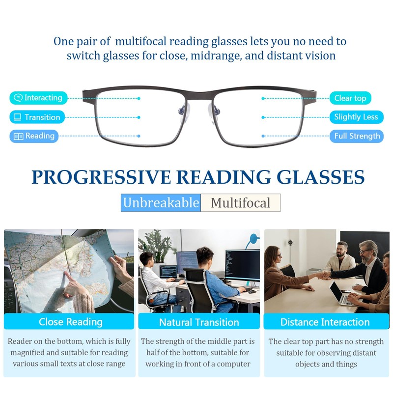 - 【Clear On Top Readers On Bottom】Progressive reading glasses for men scratch-resistant lenses allow for a seamless transition from close reading, and mid-range computer work, to long-distance viewing, meeting all your daily activities and vision needs and reducing the hassle of changing glasses