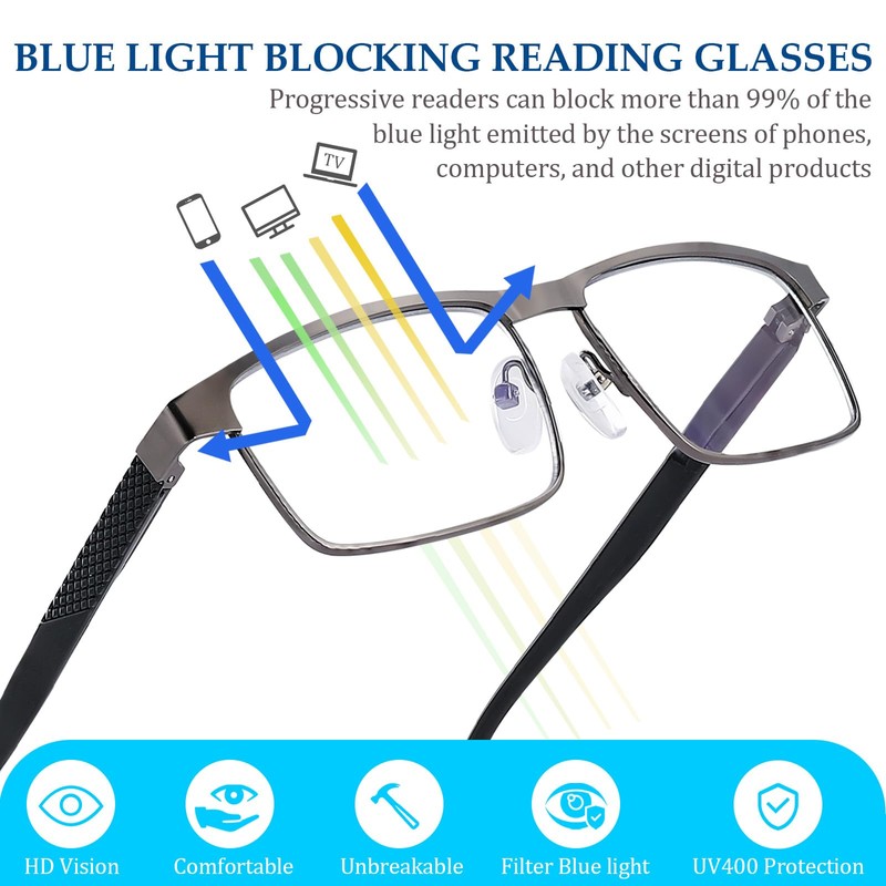 - 【All-day Comfort】Multifocus reading glasses men metal frames are advanced and lightweight, and are equipped with spring hinges to fit the bridge of the nose and ears better, progressive readers suitable for all face shapes