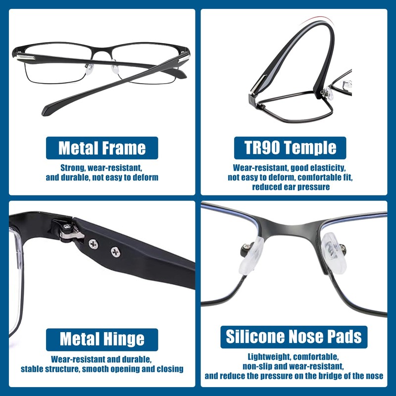 • BLUE LIGHT-BLOCKING READING GLASSES'S CLEAR LENSES WITH ANTI-BLUE LIGHT COATING KEEP YOUR EYES RELAXED AT ALL TIMES. Progressive eyeglasses can effectively reduce more than 99% of blue light emitted by electronic devices such as mobile phones and computers. Whether you're working, reading, or using electronics, anti-blue light glasses provide clear vision with all-around protection against blue light. Multifocus reading glasses for men let you enjoy your digital time to the fullest