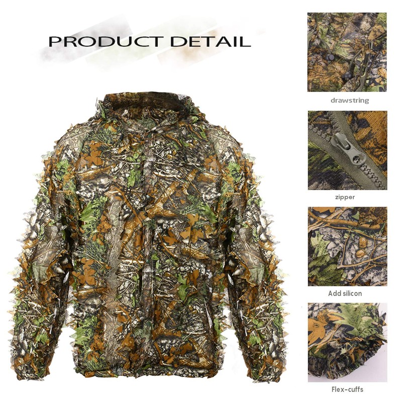 - 【Multifunctional Application】: Hooded jacket will provide better hiding.It has enough texture and camouflage effects that won't be noticed when you get close to the target. 3D leaf design camouflage suits help you finish tasks in a perfect camouflage environment. Ghillie suit designed for kids and adult jungle hunting, airsoft, shooting, wildlife photography or halloween costume play.