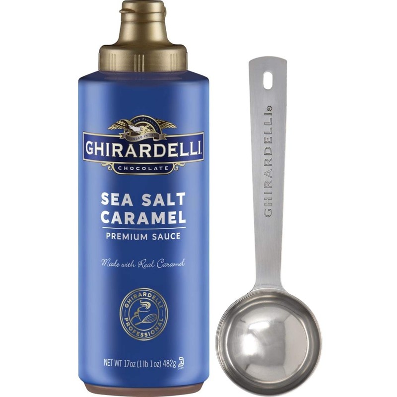 Ghirardelli - Sea Salt Caramel Flavored Sauce, 17 Ounce Squeeze Bottle with Ghirardelli Stamped Barista Spoon