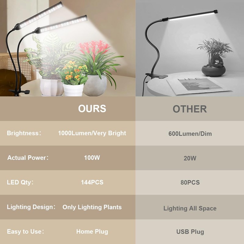 2024 New Design Version of Dual-Head Plant Growth Light This full-spectrum clip plant growing lamp contains 144 high-efficiency LEDs, suitable for all stages of plant growth. Each light contains 60 white LEDs + 12 red LEDs. This light has 4 timer switch functions and 5 brightness adjustment options, suitable for various scene requirements. 360 high-quality gooseneck allows the light to shine in any direction. No installation required. Fix the clip base and use it with the lamp facing the plant.Specifications 144LED = 120 white (6500K) + 24 red (640nm) Timing: 4/8/12/18H Lamp tube length: 8.5in Gooseneck tube length: 15in Wire length: 56.69in Clip: 4.33*1.96*1.96in Five levels of brightness: 20/40/60/80/100% Input voltage:5V*2.4A DC Life time: 1000 Operations Material:Carbon-Steel+PVCFeatures: 6500K White & Red Blue Spectrum: A mix of Red+White is best to fuel the growth of your plants.Full Spectrum380nm-800nm: Suitable for all plants to root and sprout. Red(660nm) Spectrum: for blooming and fruits.2. 4/8/12/18H Timer: with 4 options that is 4Hrs or 8Hrs or 12Hrs or 18Hrs, it is based on a 24 hour cycle from the time you set the timer. For example, when keeping power ON, if you select 8 Hrs, it will turns ON for 8 hours per 24 hours.The other two timer settings are the same.Notes It is normal for the lamp to heat up after it has been working for a period of time. Do not touch the lamp with your hands when the lamp is hot.Package:1x User Manual1x 5V/2.4A Adapter1x Grow Light with Controller