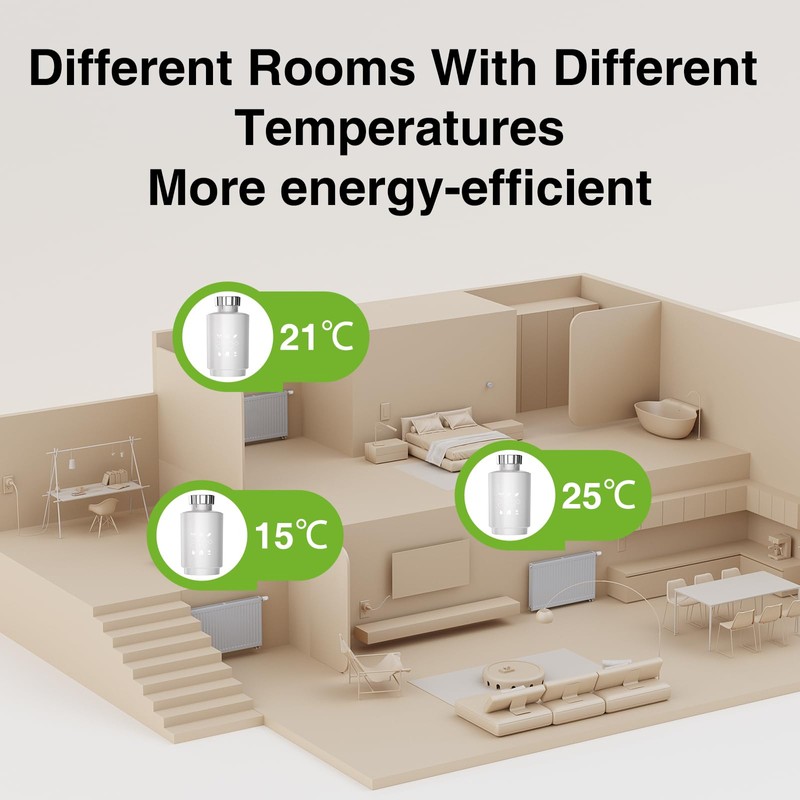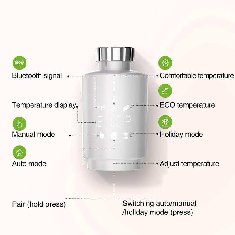- Energy saving - The radiator thermostat can automatically adjust the room temperature based on temperature plans set by the user, thus meeting different requirements in various usage scenarios. By detecting windows, the intelligent radiator thermostat automatically shuts off the heating when doors or windows are open to prevent energy waste. (battery included)