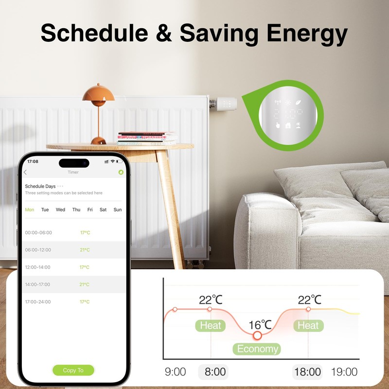 - Smart living - The thermostat also has features such as window detection, low battery alerts, temperature calibration, child lock, frost protection, and lime protection to ensure user safety and enable a smart lifestyle.