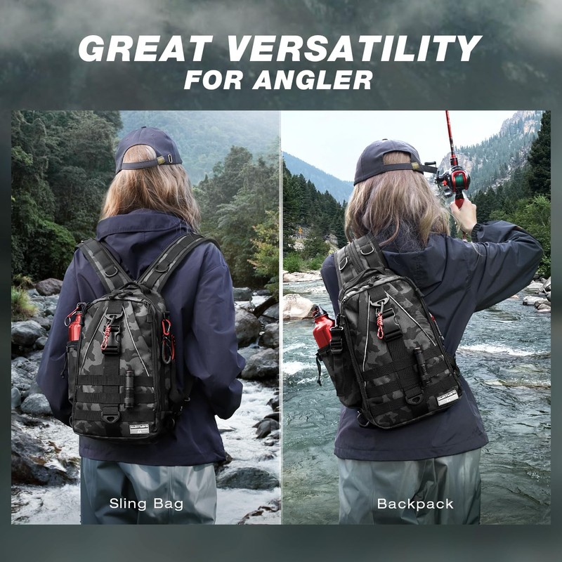 Ghosthorn Fishing Backpack Tackle Sling Bag-Backpack with Rod Holder- Lightweight Tackle Box Fly Fishing Gifts for Men Women (A.Black Camouflage)