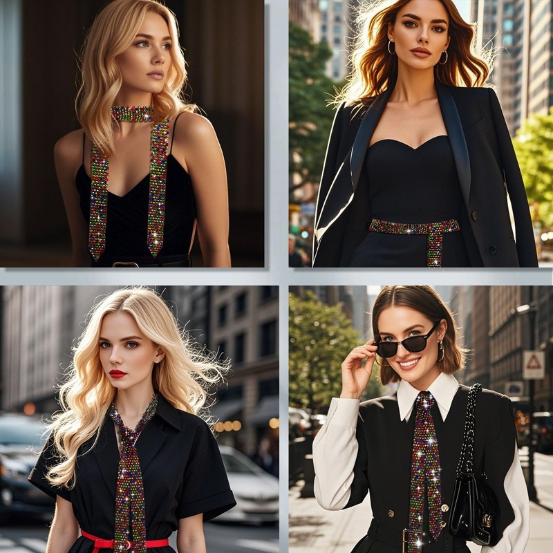 - Dynamic Womens Tie: If you love something different and sparkling styles, this piece is great for you; You won’t get tired of the rhinestone necktie for women, because it will make you get noticed; It is a nice final touch to complete your outfit
