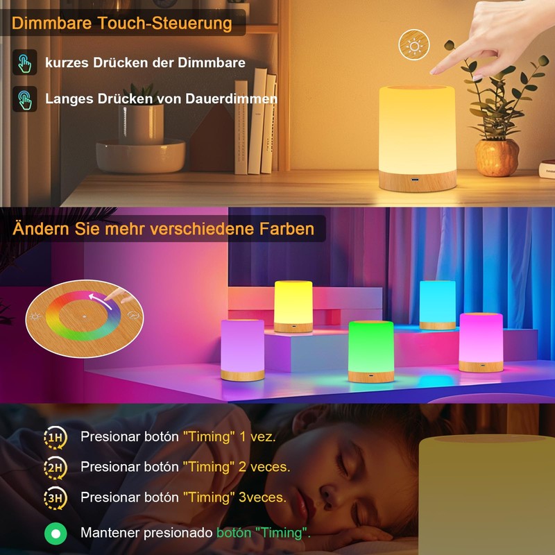 - ?Timer-Funktion?Durch Berhren des Timer-Knopfes an der oberseite nachttischlampe touch eingestellt werden, dass sie sich nach 1/2/3 Stunden automatisch ausschaltet. Das nachttischlampe mit Timer-Funktion ist eine Art intelligentes Nachtlicht, Sie k?nnen die Ausschaltzeit des Nachtlichts nach Ihren eigenen Bedrfnissen einstellen, um Ihnen eine angenehme Lichtumgebung zu bieten, die Schlafqualit?t zu verbessern, um Ihr Leben bequemer und komfortabler zu machen.