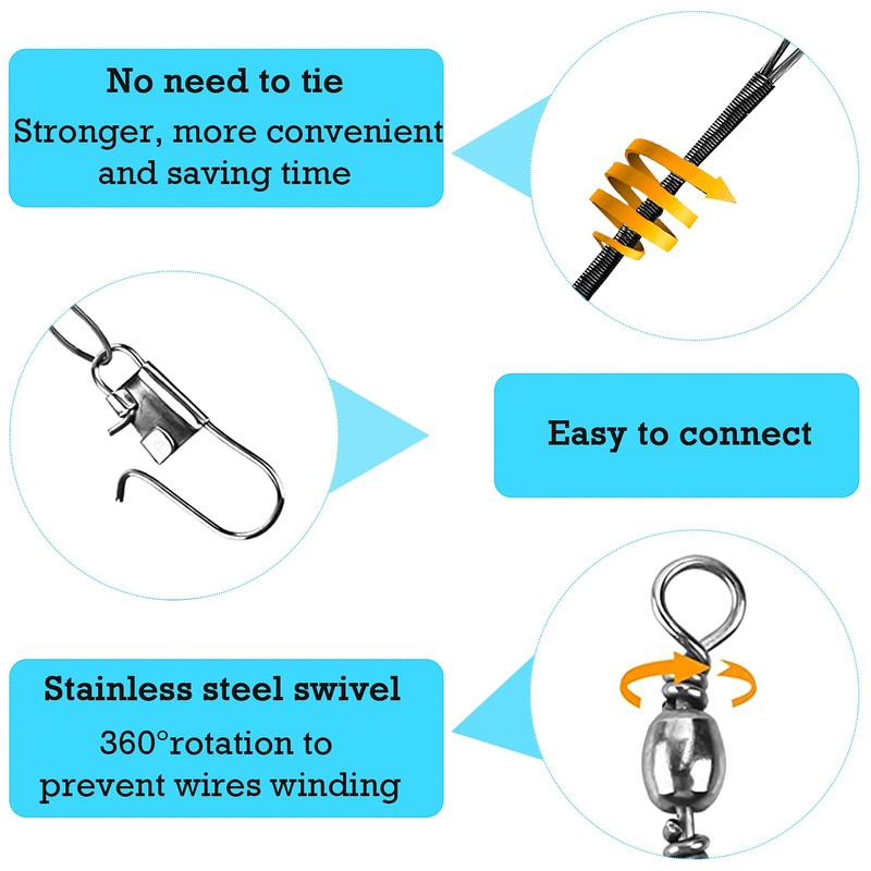 Feature : If you are a fishing enthusiast, then this one Fishing Wire Trace very much is for you!72 Pcs Fishing Wire with Snap with 3 Lengths of 15/20/25 cm.Protect the main line avoid momentary throwing and avoid damaging the main line after rubbing the main line and the guide ring.Resistance to wear after hooking bait or fish, protect the front end of the main line to avoid obstacles.Hidden main line reduce the vigilance of the fish.Buffer effect it can compensate for the instantaneous pulling force that can appear after the fish and play a buffer role.Specification:Material: stainless steelLength: 15/20 / 25cmCapacity: 15cm-6kg, 20cm-9kg, 25cm-14kgQuantity: 24pcs for each sizeColor: blackScope of delivery:72 Pieces pike traces