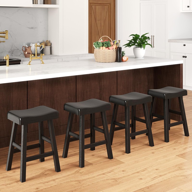 Giantex 24" Bar Stools Set of 4, Counter Height Saddle Bar Stools w/Footrests, Acacia Wood Seats, Rubber Wood Crossbars, Max Load 360Lbs, Backless Kitchen Island Wooden Barstools for Cafe, Black