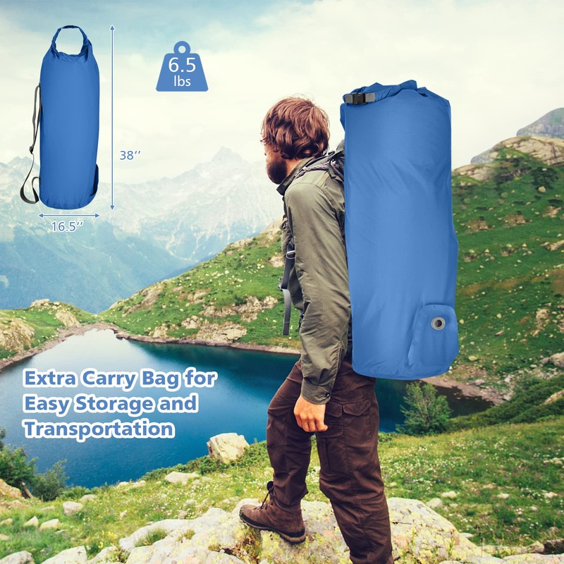 - Hassle-free Inflation & Deflation: There is no need to inflate with your mouth or a pump. Our sleeping pad is paired with a carry bag for quick inflation. The leak-proof valve makes it easy to inflate and deflate for higher efficiency. Moreover, you can blow air into the valve until the mat has reached your desired firmness.