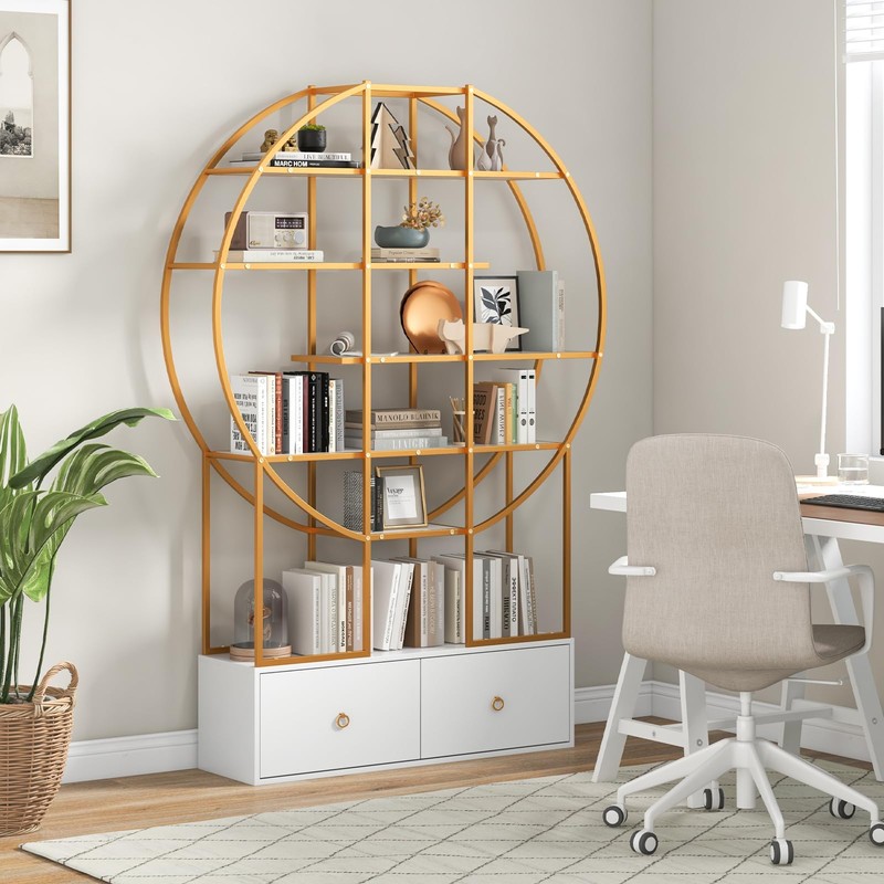 - [Modern Gold Bookshelf]: Blending with round silhouette and staggered shelves, this bookshelf exudes a high-end and elegant feel. The combination of gold lacquered metal frame and white board adds sophisticated flair to your home.