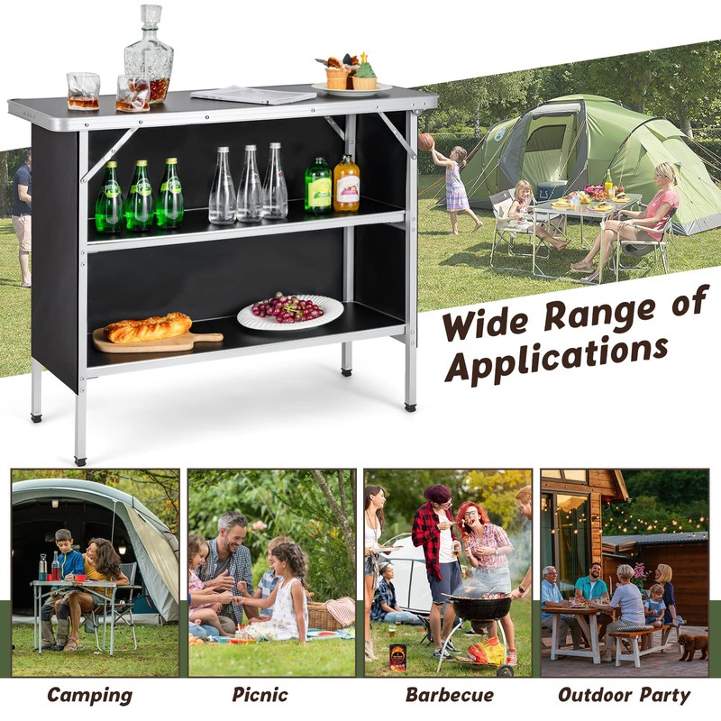 This portable bar table is designed for both indoor and outdoor events, providing a spacious 81-inch tabletop and 2-tier storage shelves to neatly organize drinks, glassware, snacks, and bartending essentials. Crafted from lightweight yet sturdy aluminum alloy, it is rustproof and built for long-term use. A removable 600D Oxford fabric bar skirt adds privacy, and it attaches easily with a hook-and-loop fastener. When not in use, the table folds compactly and features dual carrying handles along with a protective storage bag for effortless transport. Perfect for mobile bartending, cocktail stations, trade shows, catering, and outdoor gatherings.
