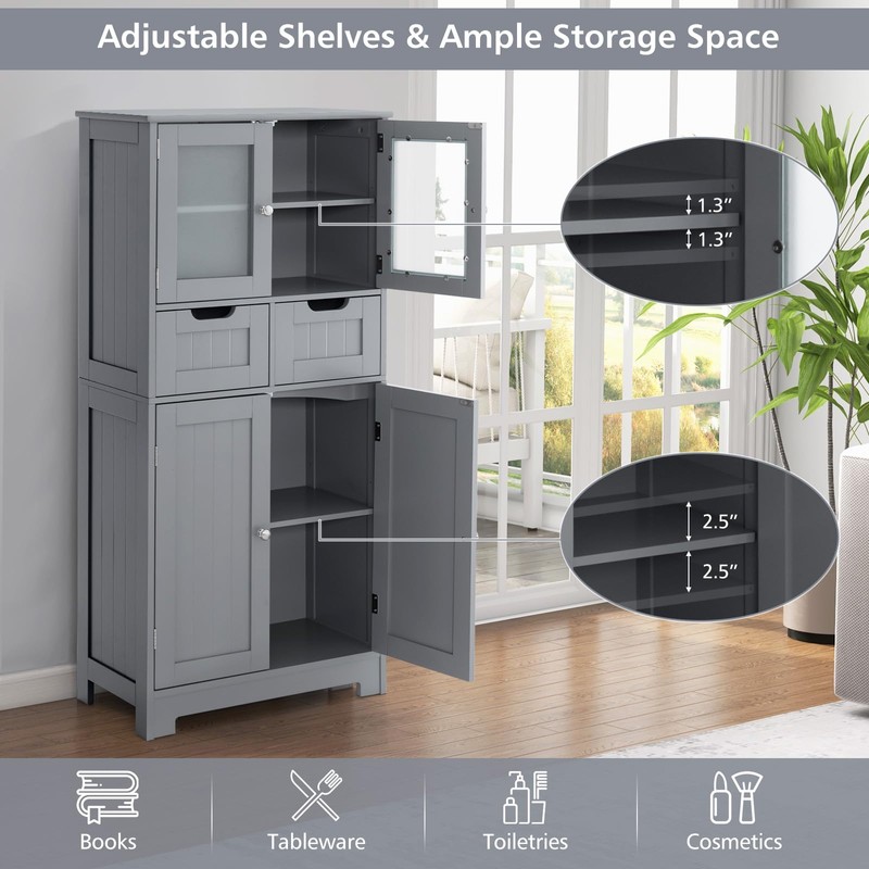 Giantex Bathroom Floor Storage Cabinet - Freestanding Cabinet with 2 Glass Doors, 2 Drawers & Adjustable Shelves, Multifunctional 50.5” Tall Storage Organizer Cupboard for Kitchen, Living Room (Gray)