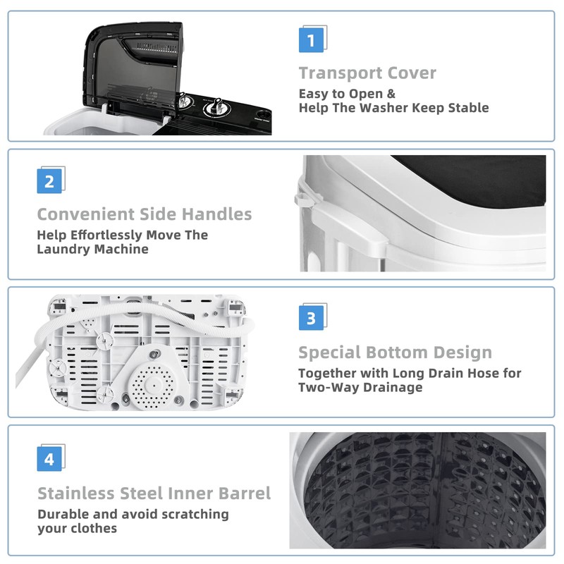 - 〖Thoughtful Details〗Except for practical functions it provided, our 2-in-1 washing machine also offers other thoughtful designs. Top lid is very convenient to open and makes taking out clothes much easier. Also, the bottom storage space for drain pipe achieves neat arrangement and two-way drainage.