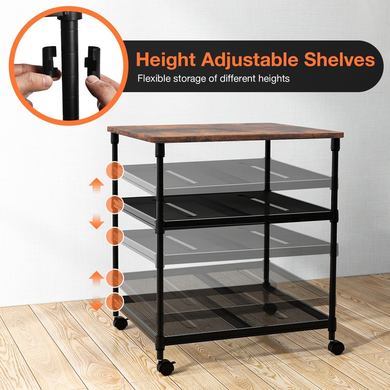 - 【Adjustable Storage Solution】: Featuring 2 height-adjustable metal mesh shelves, this printer cart allows for easy customization of storage options. Tailor the shelf heights to accommodate items of varying sizes and heights by positioning the shelves at your desired levels and securing them with convenient plastic clips.
