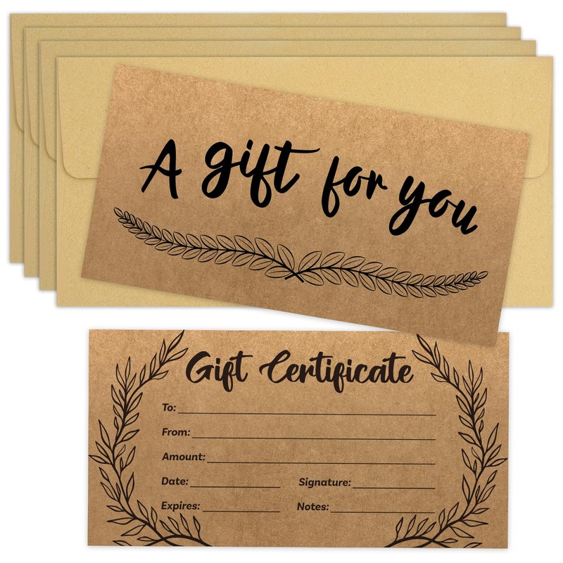 - 🏆 IMPRESS RECIPIENTS. Use these unique and elegant kraft paper gift cards to leave a deep impression on customers. Use them as promotional certificates, business gifts for clients or holiday gift certificates for business.