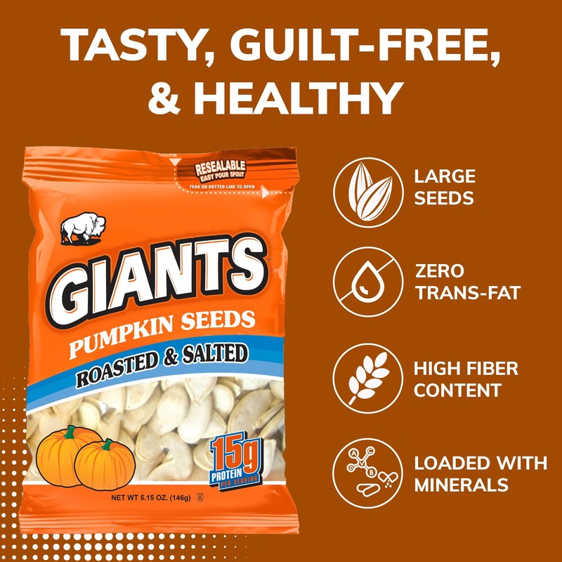 - ORCHARD-GROWN PUMPKIN SEEDS - Giants Pumpkin Seeds are made with big, high-quality, orchard-grown pumpkin seeds, roasted and salted for a delicious snack