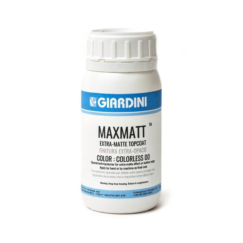 Made in Italy, the Giardini Extra Matte Clear Top Coat is used as the the final layer on colored and fashion paints. The matte top coat has two main purposes: 1) as a clear matte finish with a rubbery look/feel on the leather edge, and 2) as a protective layer against the environment such as UV rays that can fade colors over time.