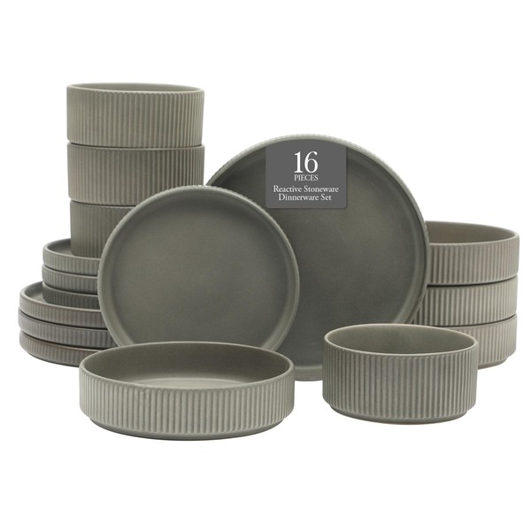 Gibson Elite Deerfield 16-Piece Stoneware Dinnerware Set – Soft Grey Reactive Glaze, Stackable Plates and Bowls, Service for 4 – Microwave & Dishwasher Safe