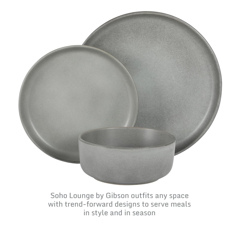 Gibson Elite Pasco 12 Piece (Service for 4) Plates and Bowls Reactive Glaze Dishes Stoneware Ceramic Dinnerware Set - Grey