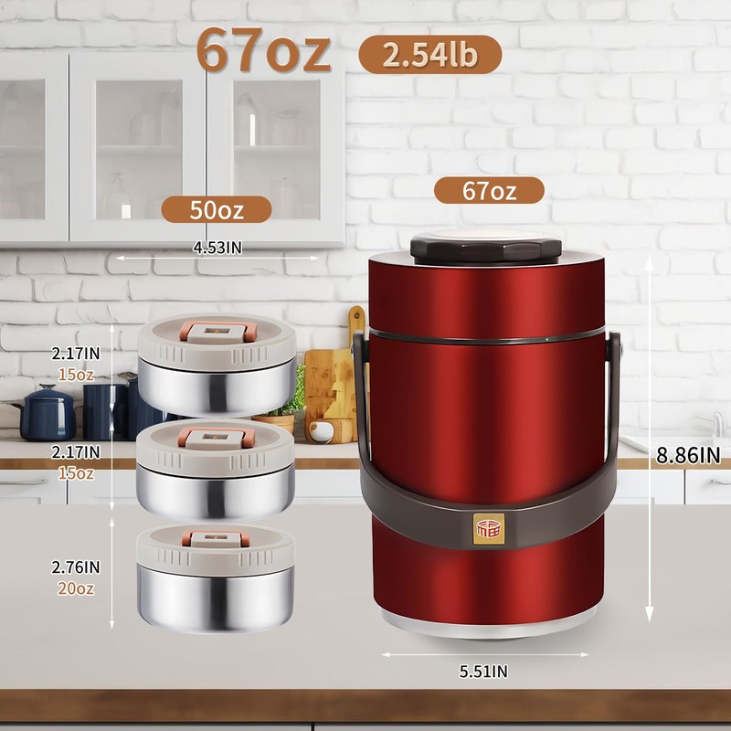 - Three-Compartment Food Container: The insulated food container has a total capacity of 67 oz, including three bento boxes with a combined capacity of 50 oz (15 oz x 2 and 20 oz x 1). You can carry soup and a variety of dishes to enjoy a richer and more nutritious lunch or dinner.