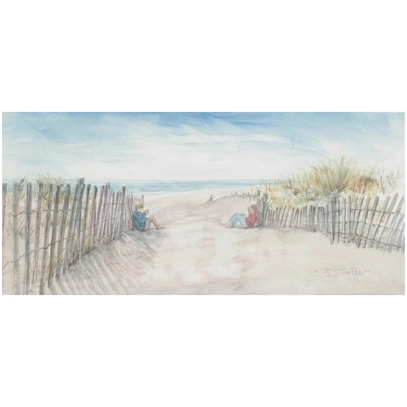 Up for auction is a giclee print of two kids reading on a beach on the Atlantic Shore, "Bookends" - it was Ocean City for sure, but not sure if it was the Jersey or Maryland one! I painted an oil painting from life (en plein air) which immediately sold so painted another version with watercolor to use for giclee printing. The boy in the background is actually my son who could only sit still for so long so he is in it twice! It is a great testament to how quiet and beautiful the Atlantic coast can be in the spring and fall! This image measures 5 x 11" with another inch of white all around for matting. This is old new stock I am offering up at my original cost. You can see the gallery price on its sticker. Best of luck in bidding!
