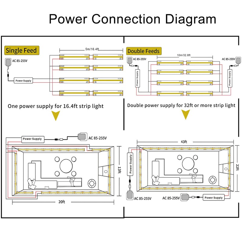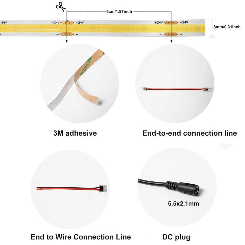 - 【cob led strip accessories package included】 1X 16.4ft COB LED strip, 1X end-to-end cob led strip light connectors 8mm ,1X strip end-to-wire LED Strip connector. Do not include 24v dc power supply and led dimmer