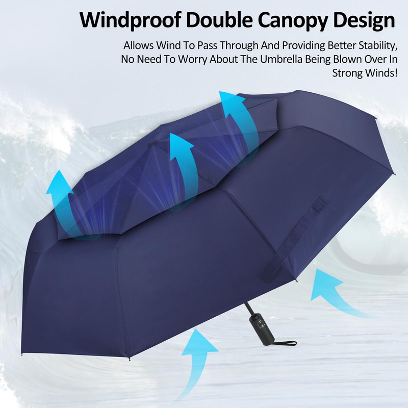 - ️ WINDPROOF Our windproof umbrella has a new vented double roof that allows the wind to flow through the air vents to prevent it from tipping over or reversing in strong gusts of wind. The reinforced metal shaft and 9 fibreglass ribs: no breaking, it will survive the elements and the test of time so you never get soaked again