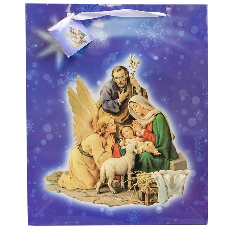 Gift Bag with Holy Family Nativity Design | Includes Tissue Paper and Gift Tag | Great Gift Wrap for Christian Occasions | Baptism, First Holy Communion, Christmas (15 Inch)