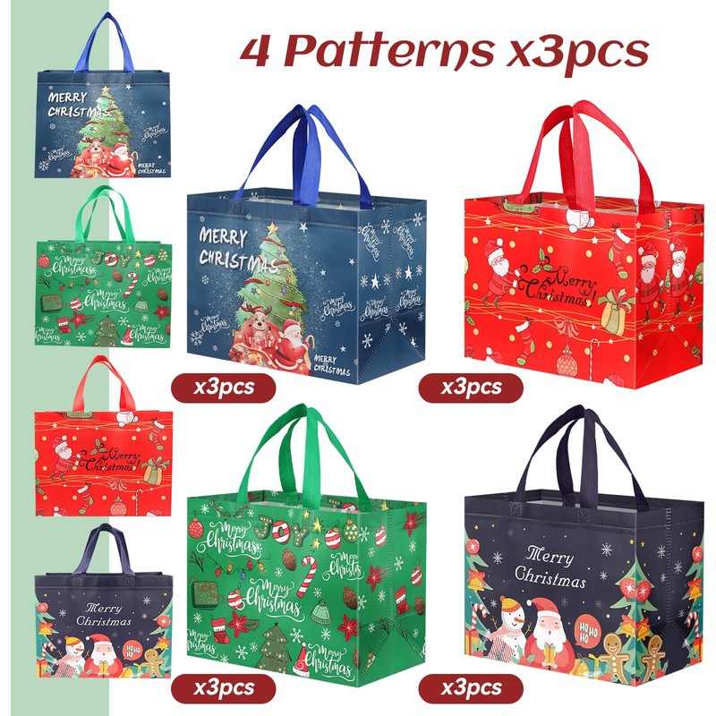 - CHRISTMAS GIFT BAGS These reusable Christmas carrier bags will stay open and upright even for loading and unloading at Christmas, filling them with Christmas gifts. Once you are done with it, you can simply fold them up and put them in a drawer or cabinet without taking up space.