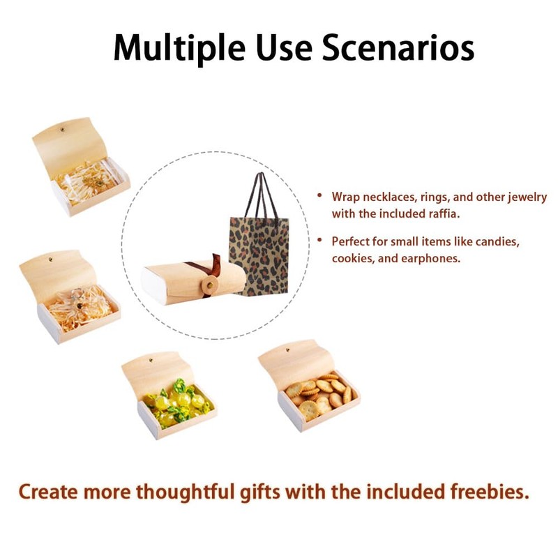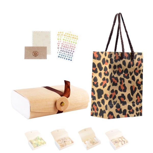 - COMPLETE GIFT SET: Includes wooden gift box with button closure, decorative leopard print bag, colorful letter stickers, special paper, and natural raffia for wrapping