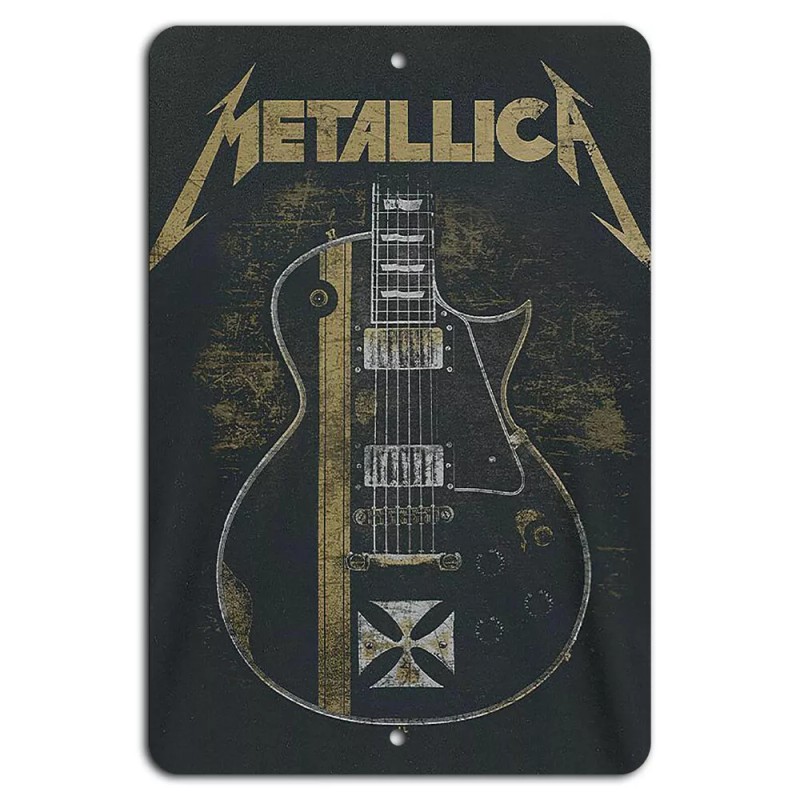 The Metallica Iconic Guitar Design Poster is an 8"x12" aluminum metal sign that is handmade in the USA. It features beloved Metallica guitar imagery, perfect for any music enthusiast.