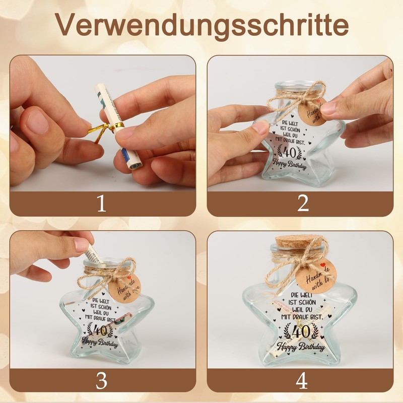 - Gift for a 40th Birthday: The chic star-shaped bottle is made of highly transparent glass and printed with the heartwarming text "DIE WELT IST SCHON WEIL DU MIT DRAUF BIST", which conveys a strong feeling of love. To commemorate the important milestone of the 40th It is an ideal gift for family and friends who turn 40 years old. It can not only be used as money gift packaging, but also as home decoration