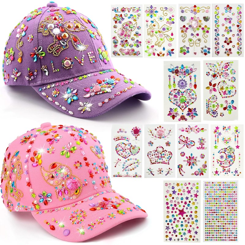 - 💜DIY Arts and Crafts for Kids - Let's decorate your own baseball cap! This craft kit comes with 2pcs baseball caps(purple and pink), 12 sheets of adhesive gems stickers designed in different patterns and a beautiful box. A complete craft kit to meet your little girls DIY needs.