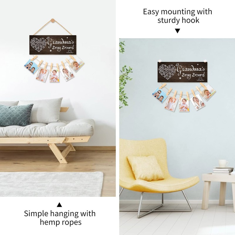 - Perfect Size and Easy Mounting: This grandparents gifts grandma's brag board measures about 13.3 x 5.5 inch and comes with 8 wooden clips for photo display, while others only offer 6 clips, nicely fit photo 4x6 or wallet size. Easy to hang it on the wall. Mounting hardware, hemp ropes and a gift card are included, for you to express your heartfelt love to your dear grandparents