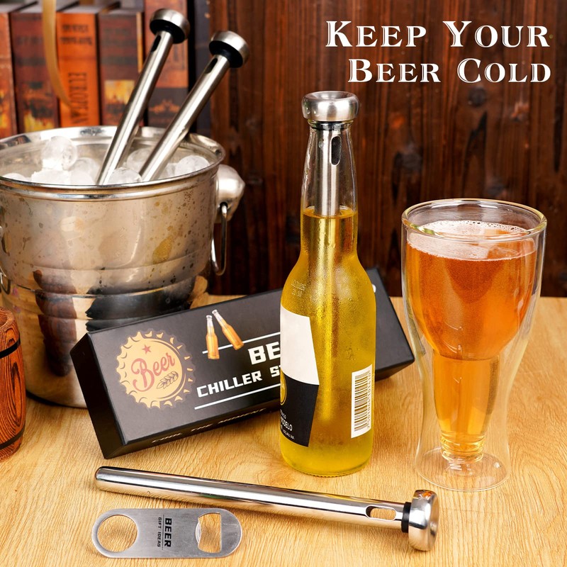 - UNIQUE BEER GIFTS: You know what is perfectly match to summer? Definetly cool drink beer! Chill your beers by this cool stuff and cheers with your dad husband drinkers, what a nice happy moment. This beer cooler set includes 2 beer chiller sticks and 1 bottle opener, fits most of standard long neck drink bottles(at least 8.2 inch tall). Best beer gifts for men women!