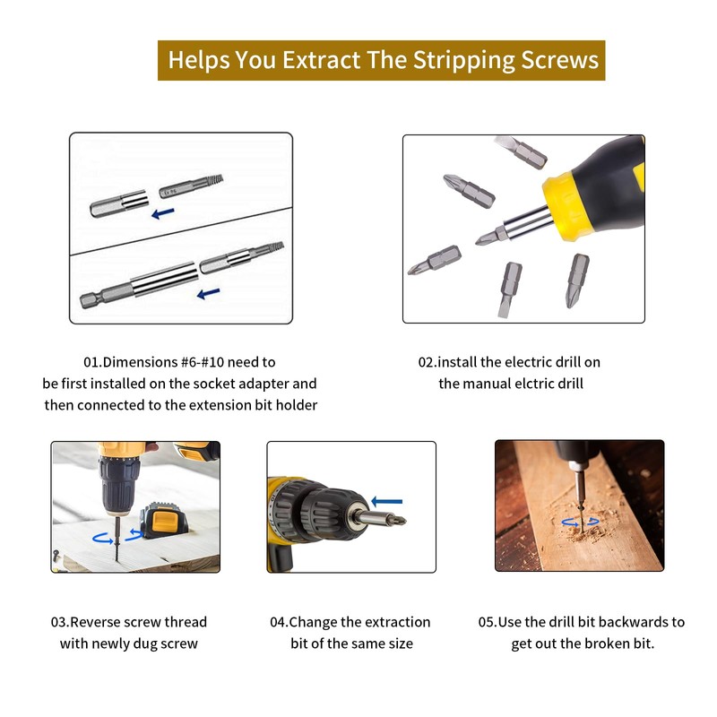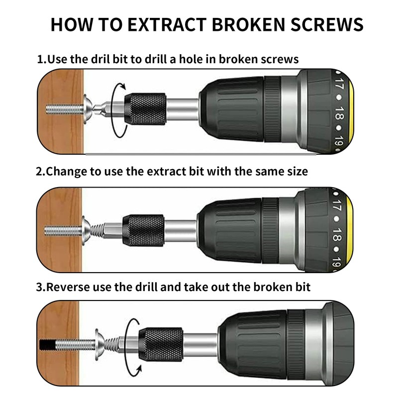 - 【Screw Extractor Steps for usage】First, select a drill bit which is smaller than damaged screw ,install the bit on the electric hand drill, and begin the extraction drill down to create a clean hole; Second, use an extractor suitable for the size of the hole, reverse rotation to and take it out.Highly suitable for various machinery repair work. Safety Tips: Please use an electric hand drill rather than hammer drill, and use it at a low speed.