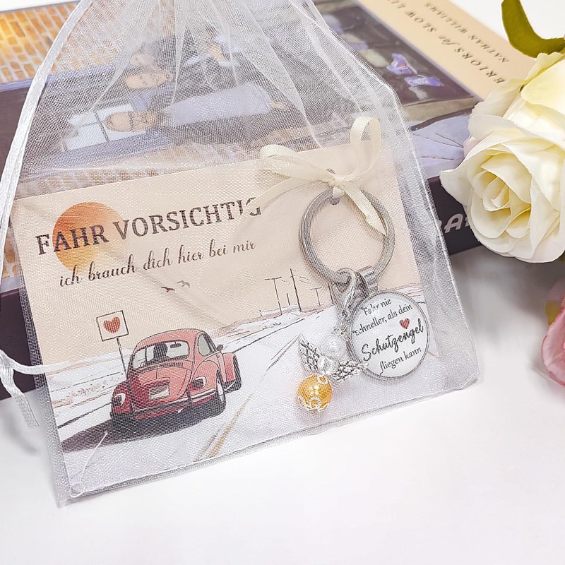 - Unique design: guardian angel keyring with the engraving "Fahre nie schneller" than your guardian angel can fly to remind your family or friends to safely enter and exit