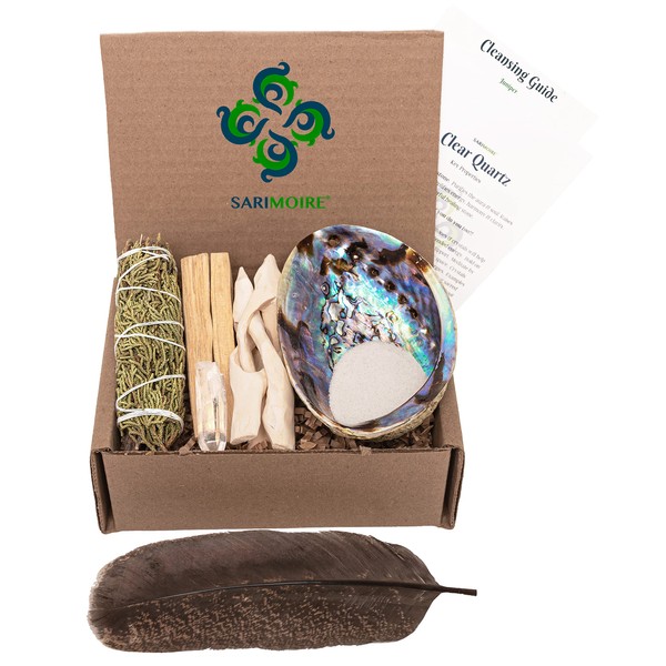 - METAPHYSICAL SUPPLIES - Perfect Smudge Kit for beginners. Includes 1 Juniper Wand, 2 Palo Santo Wood Sticks, a 5- 6 inch Abalone Shell, 2 in wood tripod stand, clear quartz crystal, white sand with cleansing guide and properties of items in your set. Perfect witch starter kit