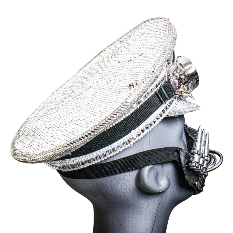 GIFTSHOP101 White Sequins Steampunk Captain Cap Kaleidoscope Goggle with Silver Mouth Mask