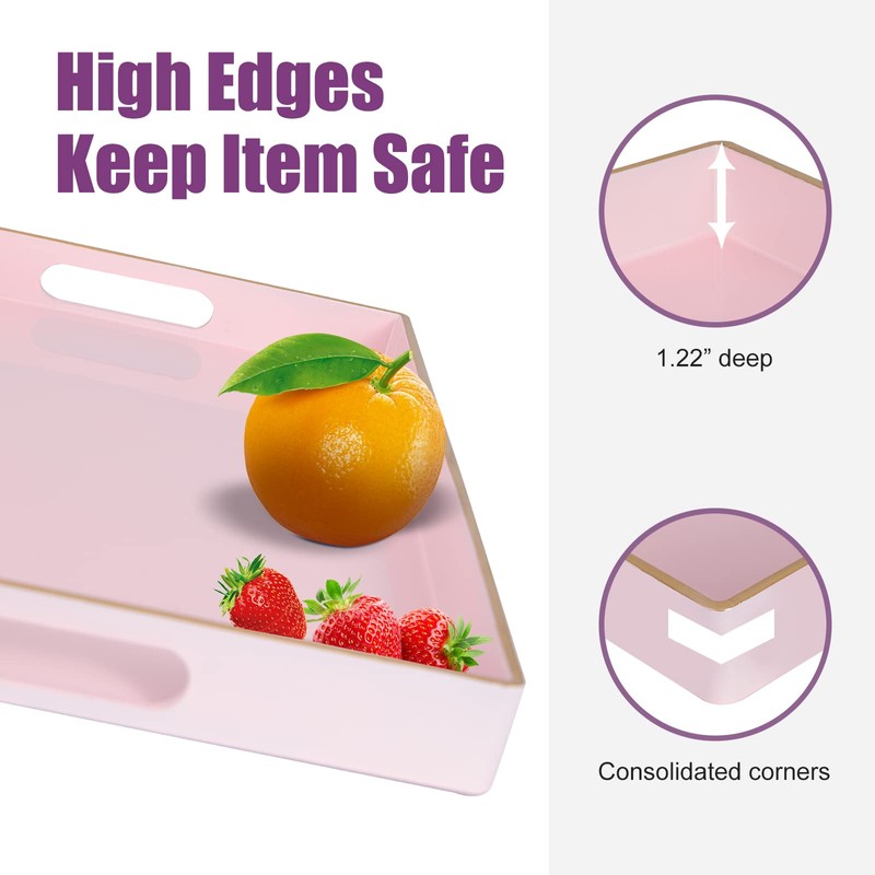- 【Multipurpose Serving Trays】Designed for display and storage, this pink serving tray can be used as a decorative tray, makeup tray, jewelry tray, service tray and desktop organization tray.This serving tray can also be used as a storage box for small items such as keys or TV remote controls. Also perfect for serving snacks, breakfast lunch or dinner.