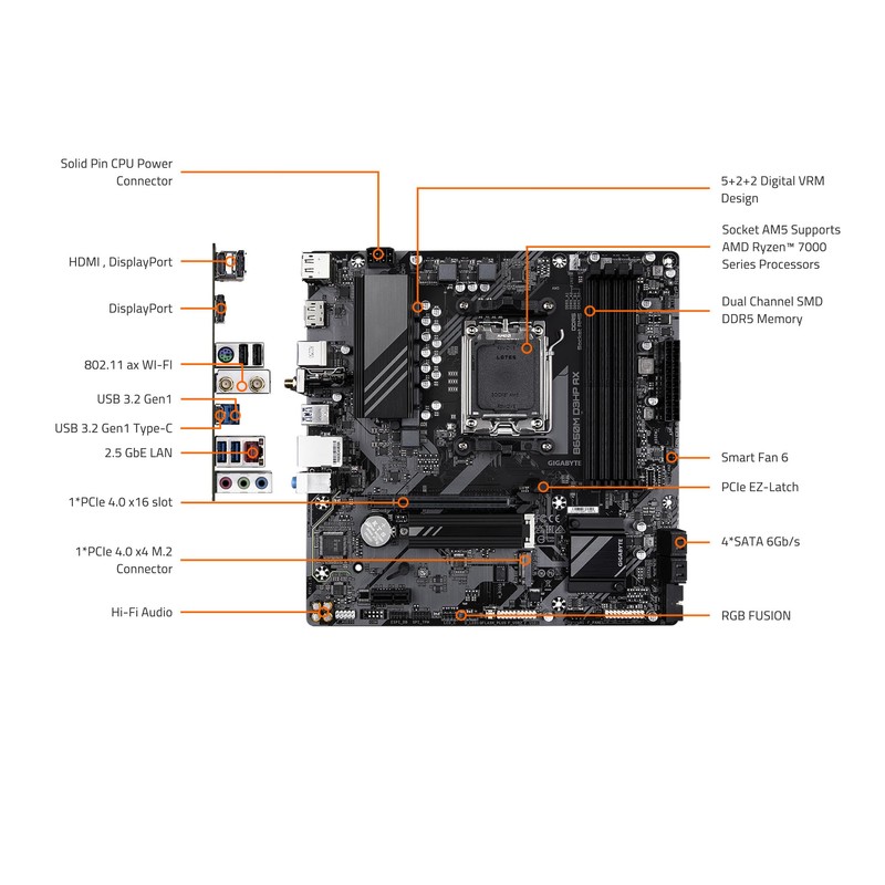 GIGABYTE B650M D3HP AX (rev. 1.0) AM5 LGA 1718 AMD B650 M-ATX DDR5, 2X PCIe 4.0 M.2, PCIe 4.0, USB 3.2 Gen2 Type-C, Wi-Fi 6E, 2.5GbE LAN