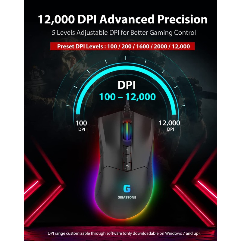 Gigastone Gaming Mouse with 12000 DPI Adjustable, RGB Backlight, Optical Sensor, 8 Programmable Buttons, RGB Gaming Mouse with 512KB Onboard Memory, Wired Gaming Mouse for Windows 7 and Up