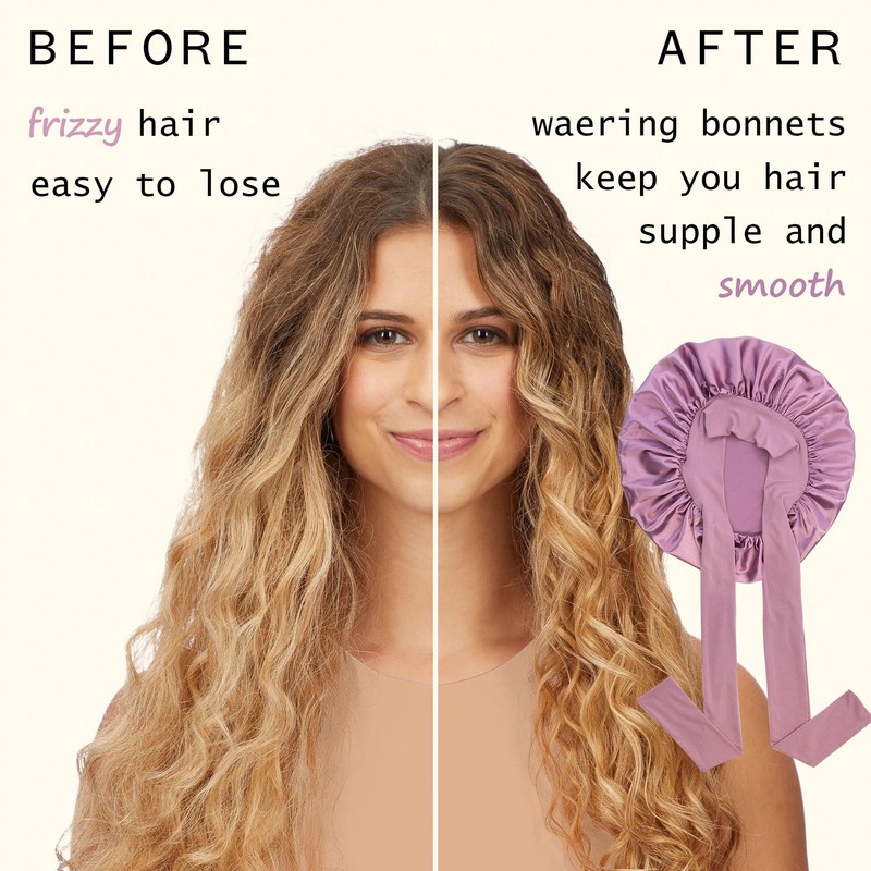 - Silky sleep bonnet for all kinds of Hairstyle: Our satin silk bonnet is designed with full cover premium satin, which will make your hair frizz-free and tangle-free by reducing friction between your hair. Therefore, they are good choices for curly, natural, wavy, straight, kinky, long hair and braids, box braids, etc.